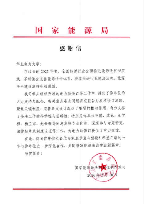 国家能源局来函感谢人文学院教师积极参与《电力法》修订