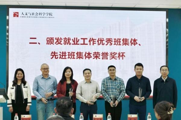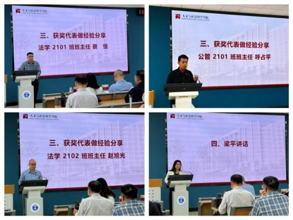结合《人文与社会科学学院关于表彰毕业生就业工作先进集体和个人的奖励方案》,学院评定就业工作优秀班集体2项,就业先进班集体3项。吴万凯与梁平共同颁发获奖班集体荣誉奖杯,对2025届就业工作中表现突出的班级予以表彰。法学2101班班主任蔡恒、公管2101班班主任呼占平、法学2102班班主任赵旭光,围绕就业动员、就业指导、学业帮扶、未来规划等方面作经验分享。